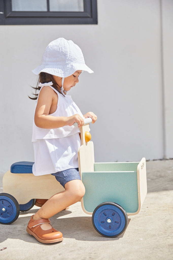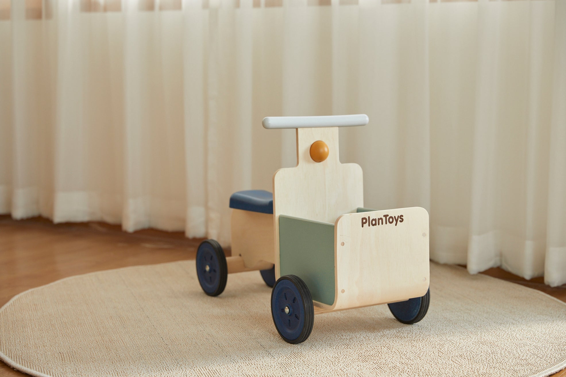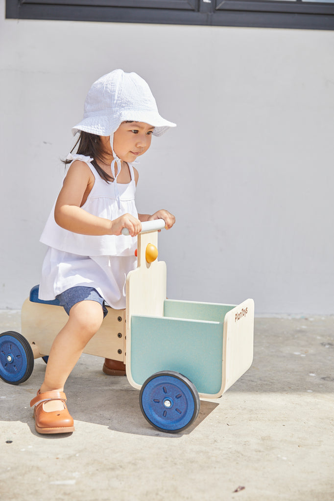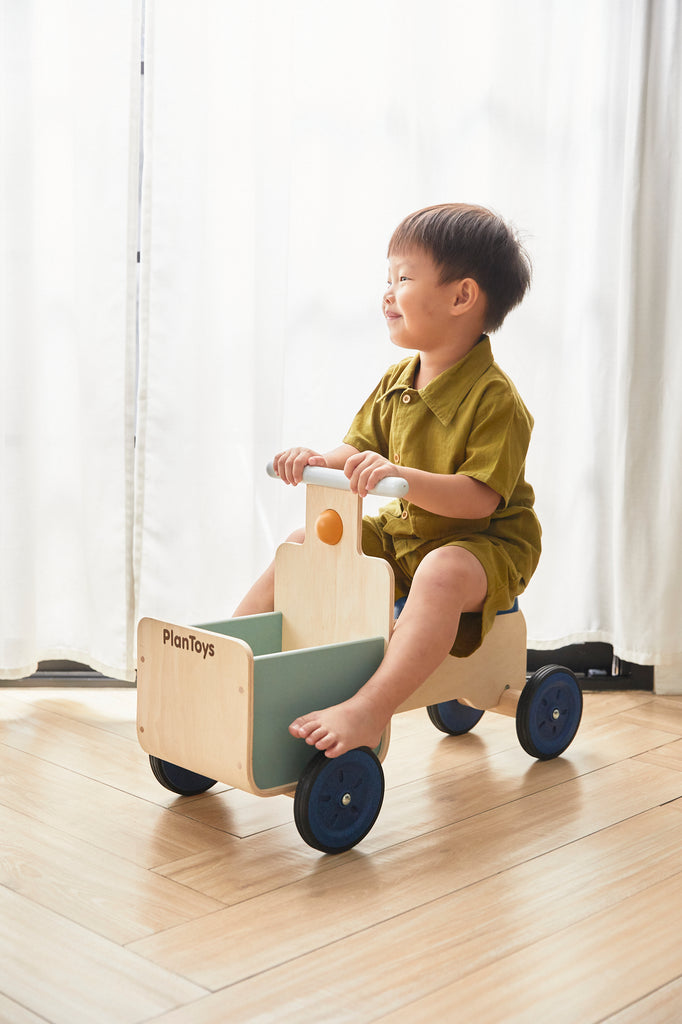 ¡Es tiempo de entrega! Vamos a dar un paseo con esta bicicleta de reparto. ¡Cuenta con un contenedor de almacenamiento, una base estable, empuñaduras resistentes y un botón para hacer "bip bip"! (Capacidad de peso: 60 kg.)