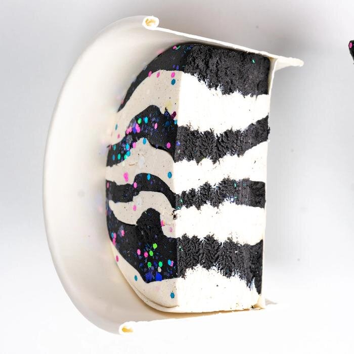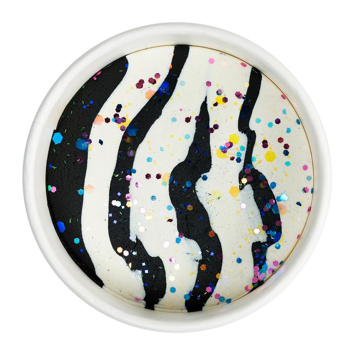 Color: black and white with multi-color glitter.