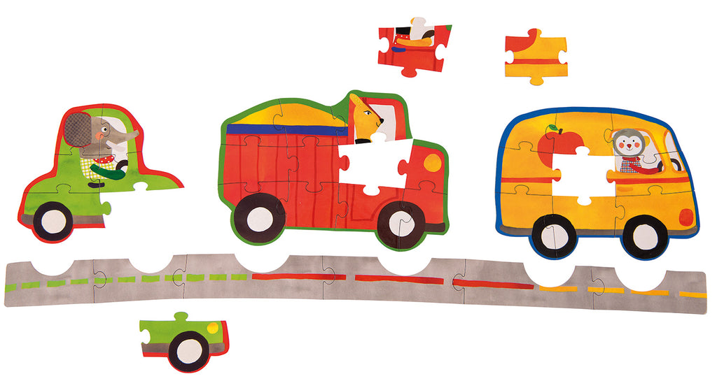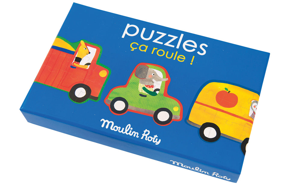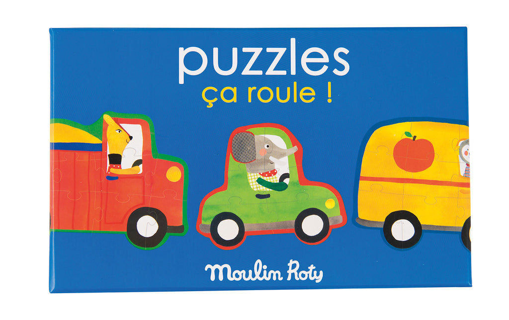 This box contains 4 puzzles of 6 to 11 pieces each. Your little one must match the 3 colorful cars driven by the Popipop characters with the road they travel on in their corresponding place.