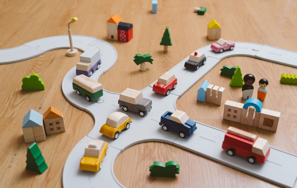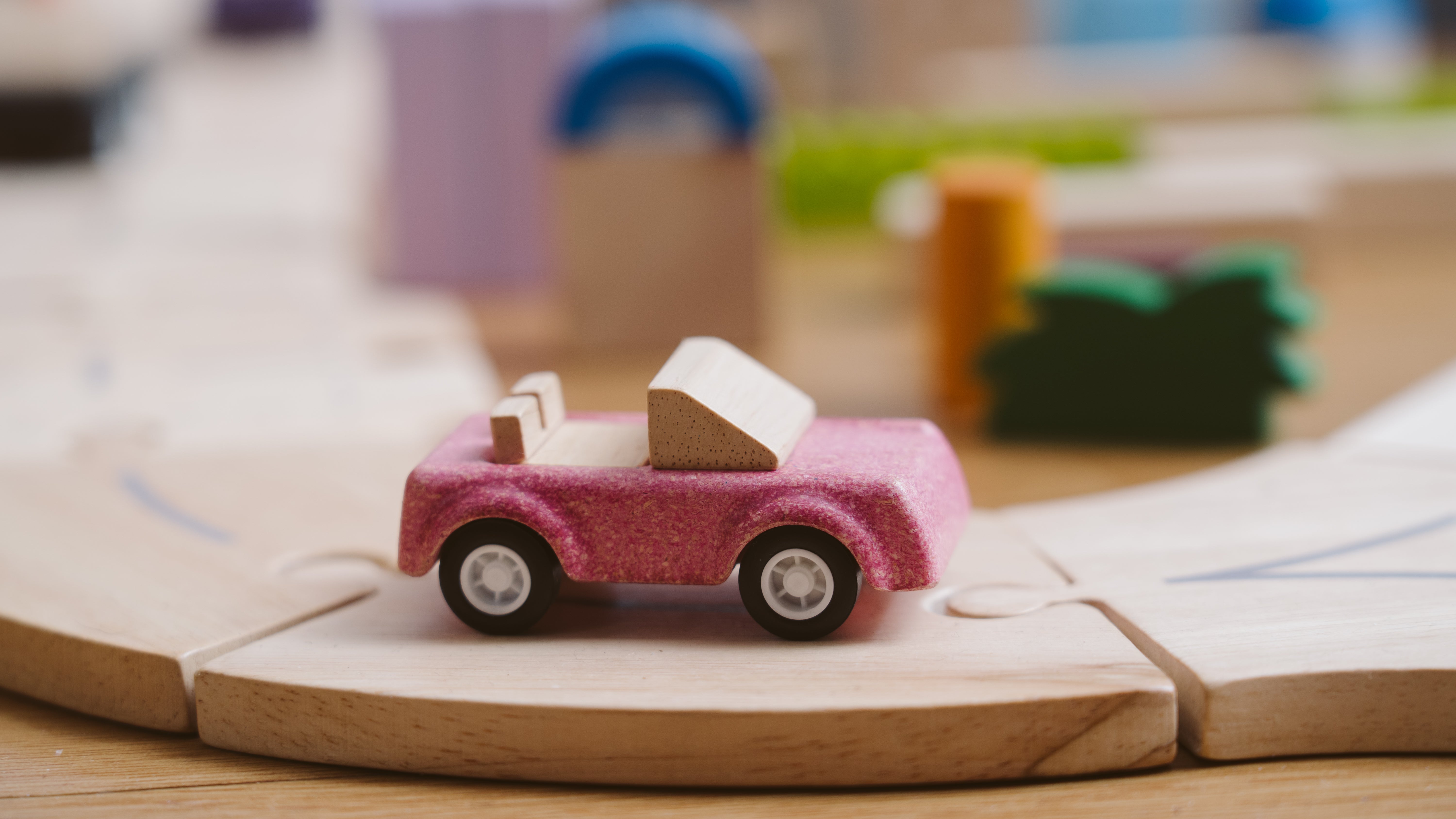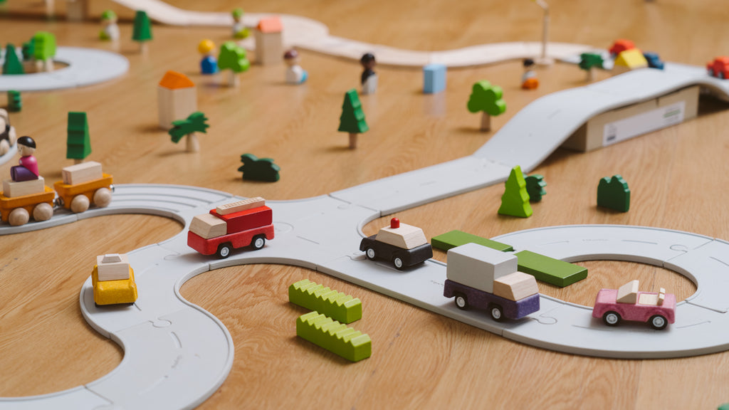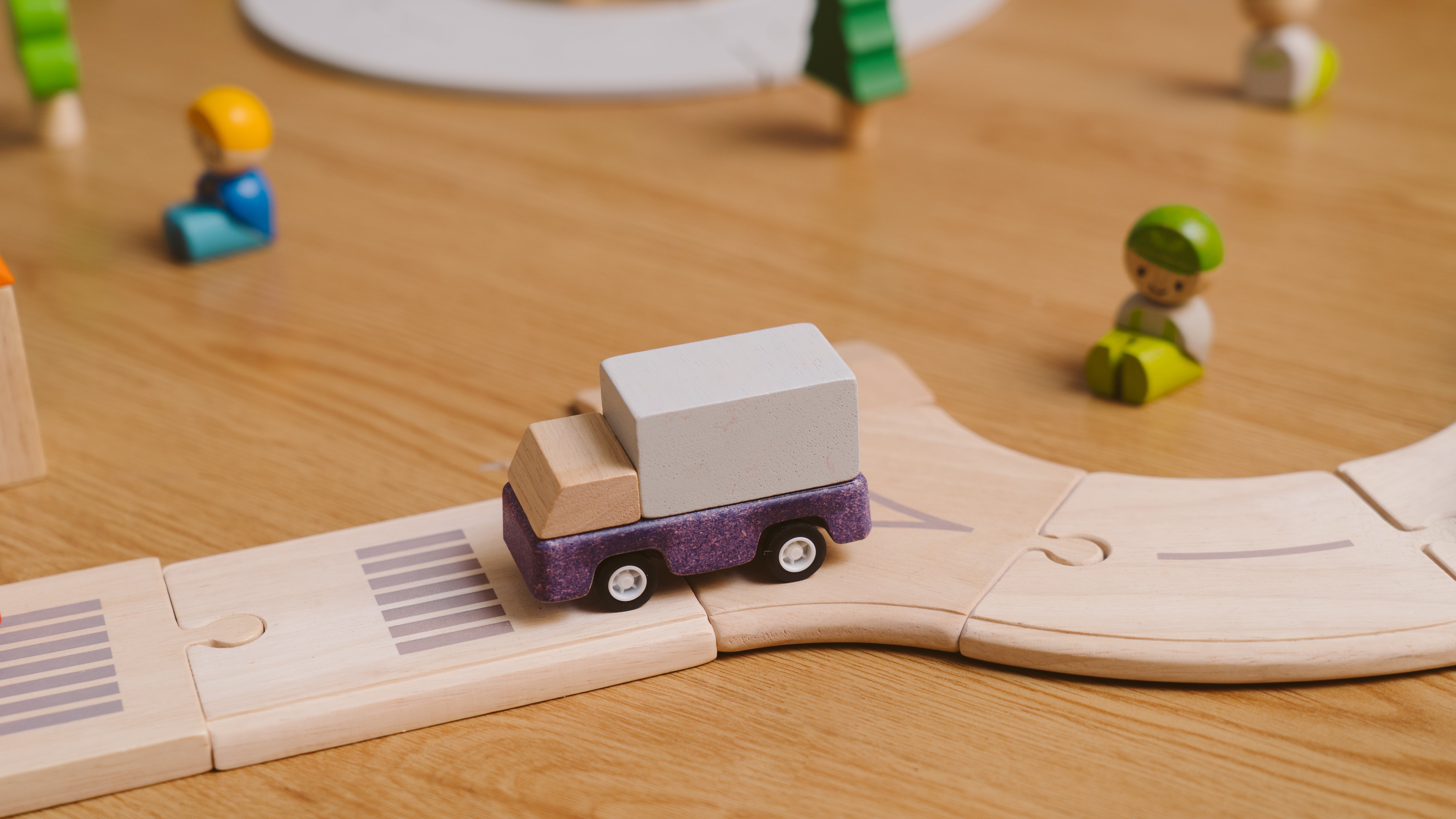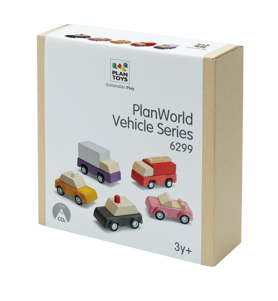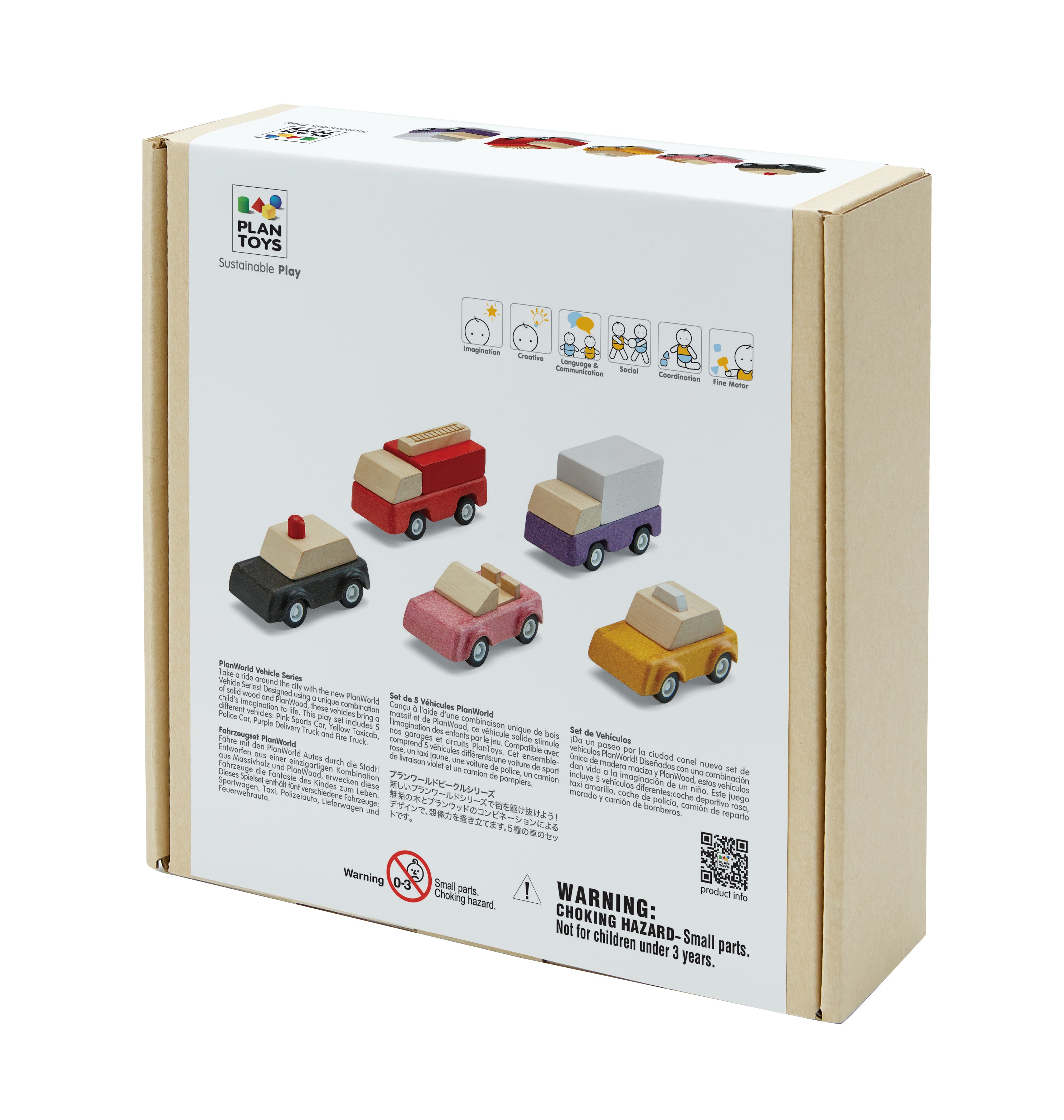 Take a ride around the city with the PlanWorld vehicle series. Designed with a unique combination of solid wood and PlanWood, this set includes 5 different vehicles: a red fire truck, a purple truck, a yellow taxi, a pink convertible, and a black police car.