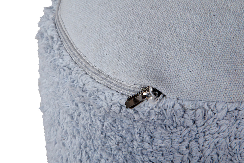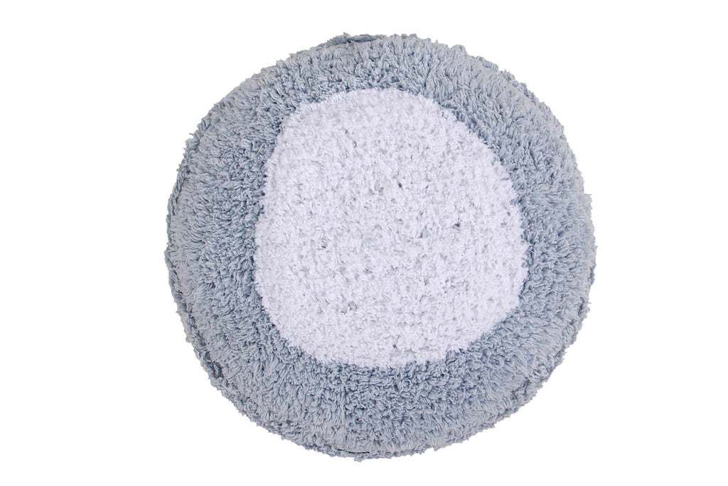 Mini Puff redondo en dos colores, blanco y azul, perfecto para la habitación de tus hijos. Es apilable para que no ocupe espacio, ideal como asiento extra. Tiene una cremallera para desenfundar y poder lavarlo facilmente.