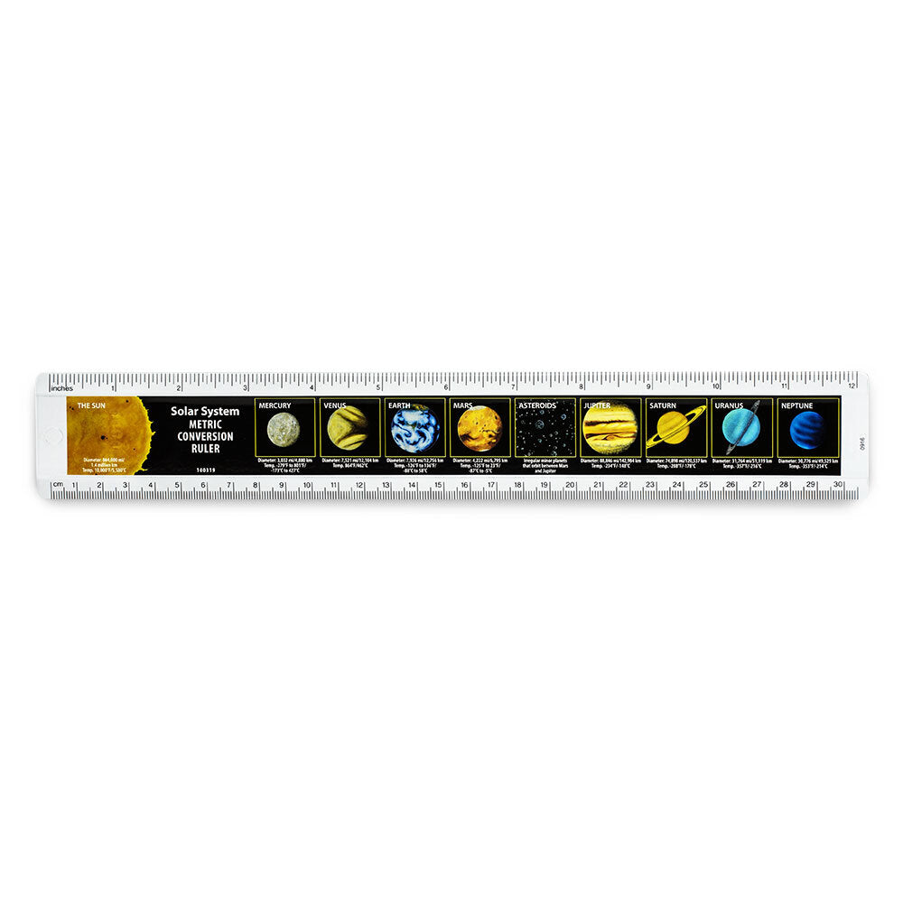 Tamaño y color: el borde métrico de esta regla incluye centímetros y milímetros, mientras que el borde estándar permite medir hasta dieciseisavos de pulgada. Las imágenes en color real del sol y los planetas aumentan el realismo y el valor educativo.